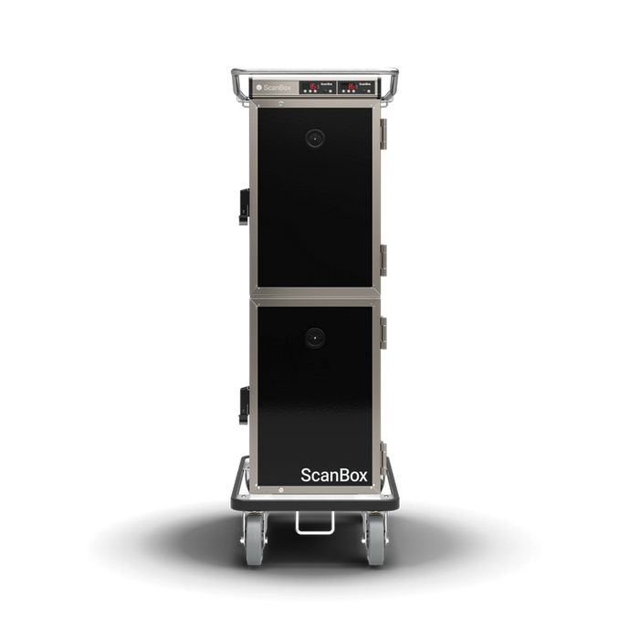 Ergo Line Combo H6+H6 is a light weight, yet heavy duty, cart for holding and transportation of hot food with GN1/1 capacity. One cart but two separate compartments that each hold 6 runners. Equipped with fan heating system (F) which provides fast and uniform heating. User friendly temperature controller with infinitely variable temperature setting up to +90°C. Total capacity of 12 GN1/1 containers given 65mm CC. Detachable U-shaped runners offer safe handling, easy cleaning and optimal temperature distribution. Other features are adjustable ventilation for optimal moisture control, ergonomic top frame handle and easy-to-roll 160mm castors. A ScanBox is a Scandinavian designed product made for both back and front of house, especially with the Signature option with the possibility to customize the exterior design.