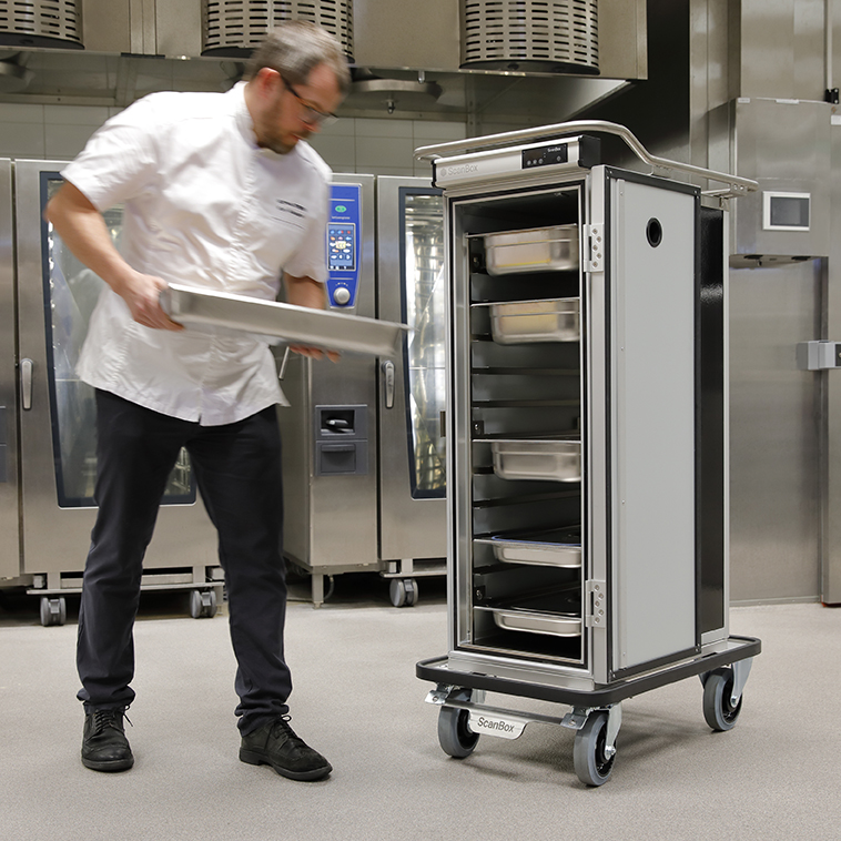 Ergo Line H12 is a light weight, yet heavy duty, cart for holding and transportation of hot food with GN1/1 capacity. Choose between static heating system (S) or fan heating system (F). The latter provides fast and uniform heating. User friendly temperature controller with infinitely variable temperature setting up to +90°C. Total capacity of 12 GN1/1 containers given 65mm CC. Detachable U-shaped runners offer safe handling, easy cleaning and optimal temperature distribution. Other features are adjustable ventilation for optimal moisture control, ergonomic top frame handle and easy-to-roll 160mm castors. A ScanBox is a Scandinavian designed product made for both back and front of house, especially with the Signature option with the possibility to customize the exterior design.