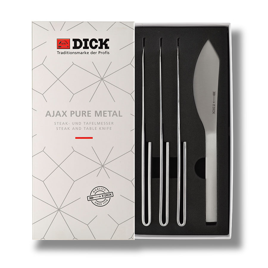 The interplay of the material, shape and design of the PURE METAL steak and table cutlery results in an exceptional experience with intuitive handling. With the PURE METAL series, DICK now also offers cutlery for the table. The blade shape of our steak and table knife took its inspiration from our successful AJAX chef’s knife. With the new interpretation of the AJAX blade shape, whose design dates back to the 1930s, we have once again succeeded in balancing tradition and modernity. The modern ‘Bauhaus’ style has already been the leading style from the 1920s onwards. The stylistic language and functionality are defining elements of the design. This is clearly reflected in the shaping and the clear line of our steak and table knife’s handle, with its emphasis on puristic industrial design.