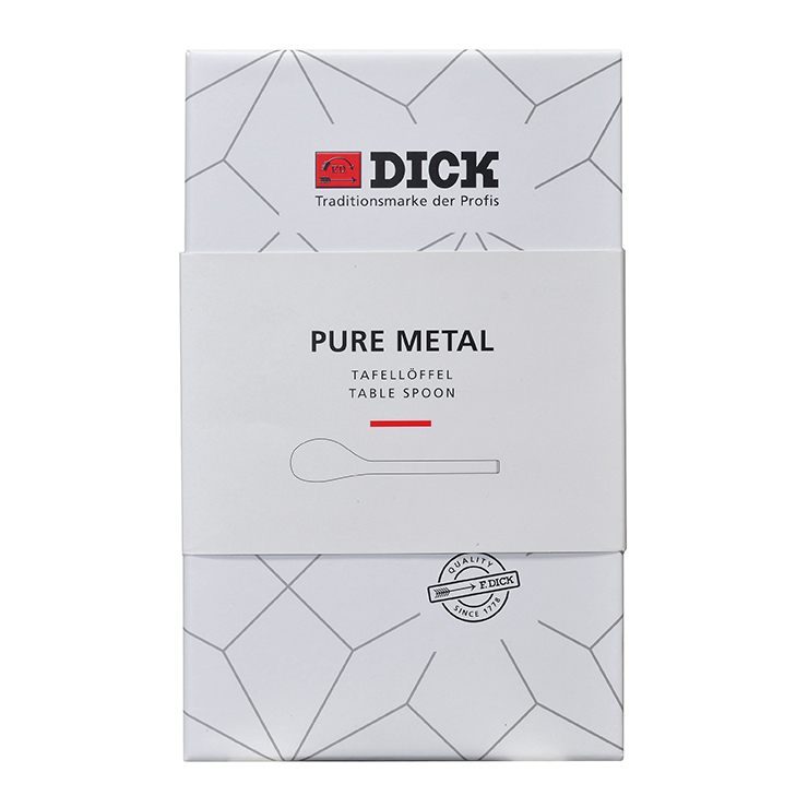 With a focus on purist industrial design, the PURE METAL tablespoon stands out with its unusual shape and follows the clear lines and design of the PURE METAL series knife and fork. The PURE METAL tablespoon has a silky matt surface in tried-and-tested steel quality. The distinctive bowl of the tablespoon is ideal for soups, stews or even desserts. The weight of the spoon is evenly distributed so that it is well balanced and comfortable in the hand. Originally, spoons were completely round, modelled on a hollow, cupped hand. This has changed over time into the oval shape that they are today. F.DICK enhanced the shape again to fit with the typical asymmetric design of the PURE METAL series. At first glance, the shape is uncharacteristic, but immediately impressive and familiar when used for the first time.