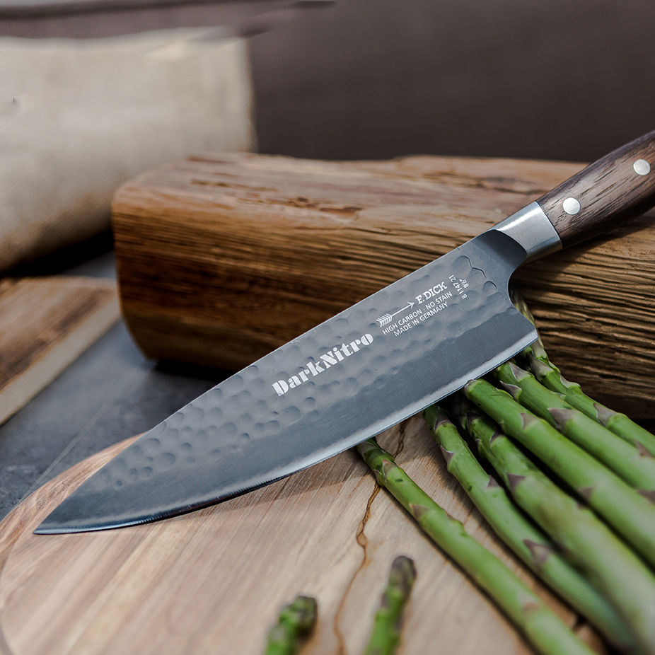 Friedr. Dick uses a special martensitic, stainless and nitrogen-alloyed steel in the DarkNitro series. This results in a unique combination of excellent cutting performance, exceptional hardness of 61 HRC and special corrosion resistance. This corresponds to the highest achievable hardness to date without any negative influence on the microstructure and stability.For a perfect material structure, DarkNitro knives are forged in a special process and then ice-hardened at temperatures down to -197°. The very fine microstructure of the steel allows for simple sharpening, resulting in a very sharp cutting edge. The anthracite-coloured blade gives the knives their pure industrial beauty. The hammered finish on the blade underlines the uniqueness of each knife.