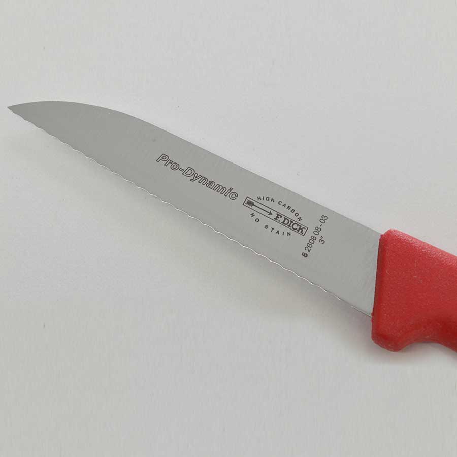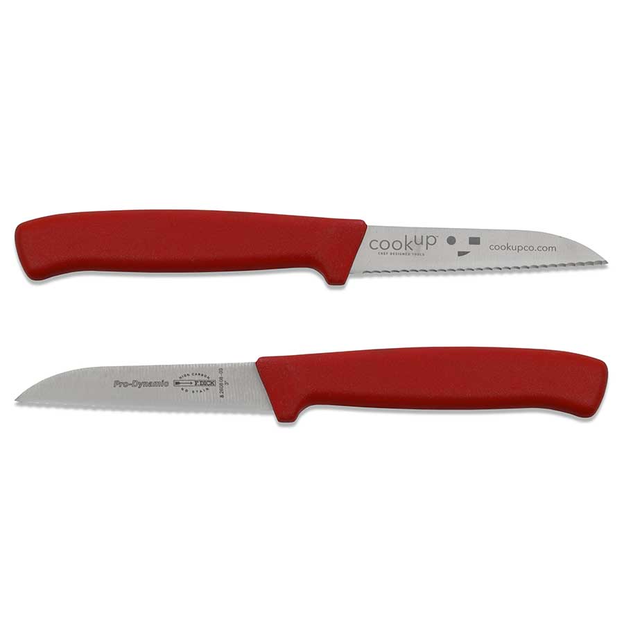 This F.Dick ProDynamic paring knife features a 3-inch serrated blade and red handle. The CookUP company logo is laser-etched on the reverse side of the knife blade. Each ProDynamic series knife is rigorously inspected for quality standards. This knife provides consistent cutting performance with an ergonomic, soft plastic handle for comfort.