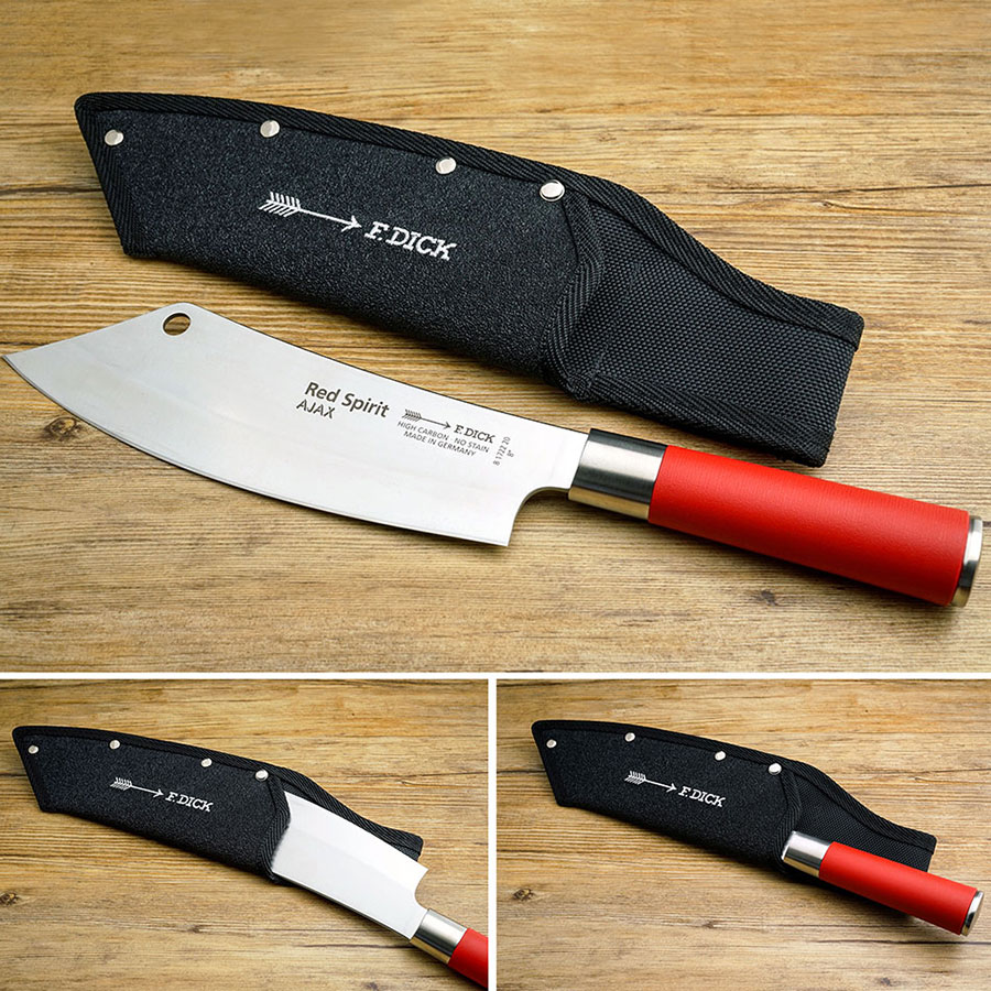The Red Spirit Ajax knife with sheath and gift box makes an elegant gift idea for any chef or foodie. The striking style of the blade design, featuring a wide side and curved cutting edge, is ideal for cutting meat and poultry. Thanks to the practical hole in the blade, the knife can be hung up without any problems. Or, use the sheath to protect your blade when storing the knife. This is the perfect knife and gift set for all BBQ enthusiasts and meat lovers who value lasting quality and true craftsmanship.