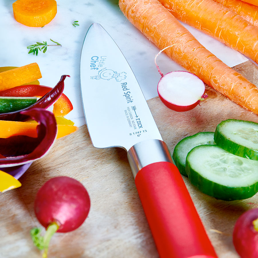 The blade of the Little Chef's children's chef's knife is sharply ground like our chef's knives. This is also particularly important with a children's knife as cutting requires less effort and pressure and so the knife does not slip while the child uses it. Our F. DICK Red Spirit Little Chef knife brings safe fun for children to the kitchen and with a blade length of 15 cm is specially adapted to the needs of the little chefs.