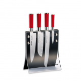 > Acrylic display block with Red Spirit Chef knife, paring knife, bread knife and Santoku knife.