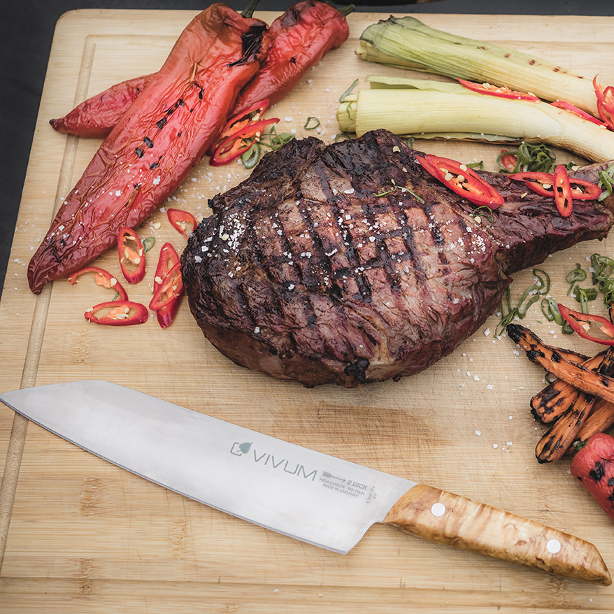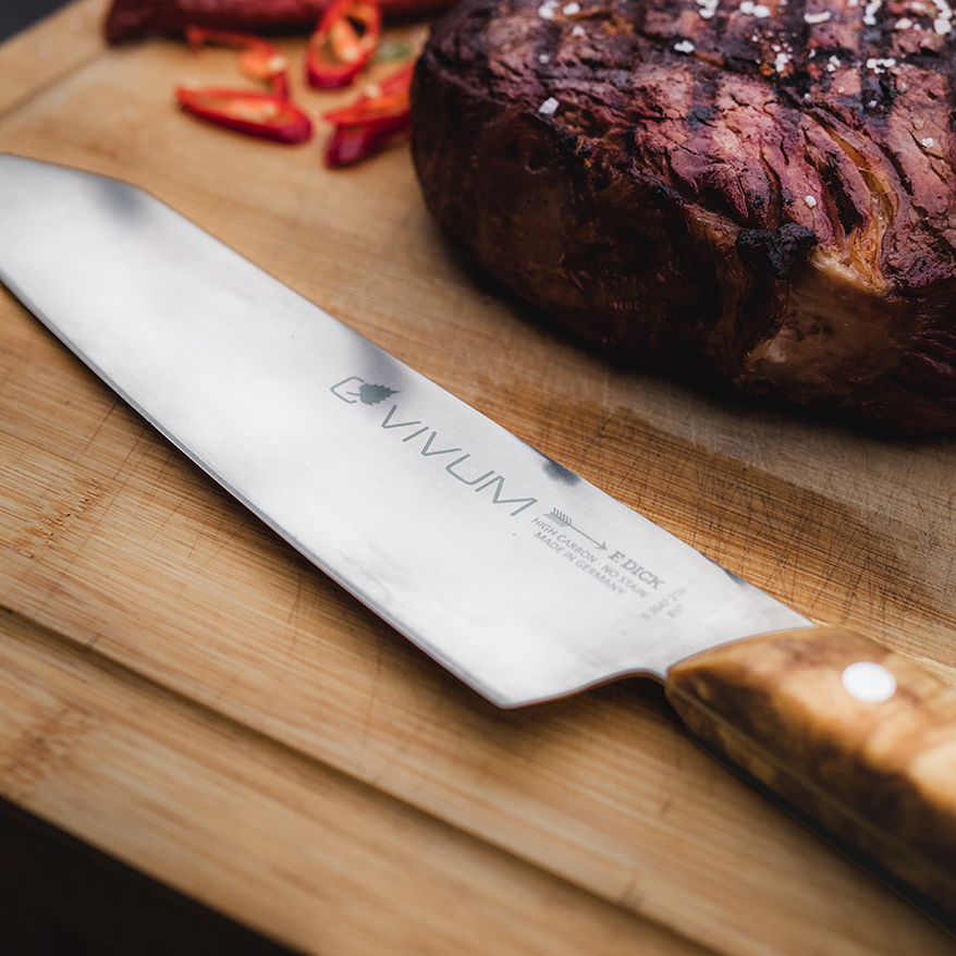 The VIVUM series stands for manual craftsmanship instead of serial uniformity. As a unique piece, each knife is finished by hand by our experienced staff. We use a special high-alloy steel for the VIVUM series because the steel quality significantly contributes to a sharp cutting experience. This steel offers excellent cutting performance, exceptional hardness and good corrosion resistance. During the hardening process, the blade is hardened under protective gas at 1,100 °C. The blades are then ice tempered down to -197° C to ensure the necessary flexibility and resilience of the knives and to optimise the material structure. This results in an optimal hardness of 58 HRC. The knives are therefore extremely sharp and ready for use in kitchens and on barbecues around the world.