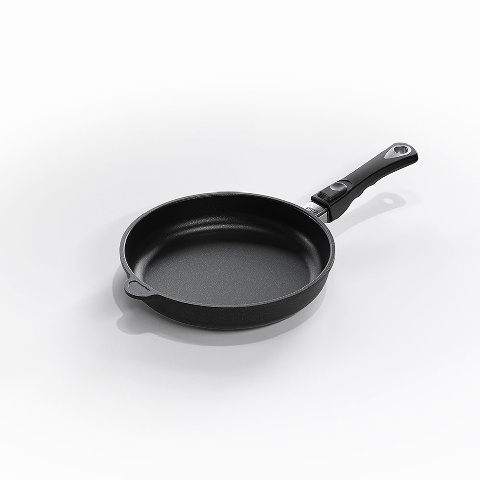 AMT also features an exclusive detachable handle option. This handle option features a quick-release button. Simply press and slide the button backwards to release the handle from the pan. This intelligent feature provides a child-proof cooking experience. The detachable handle is also convenient for both cleaning and space savings when storing your pan(s) in smaller kitchens or cupboards.