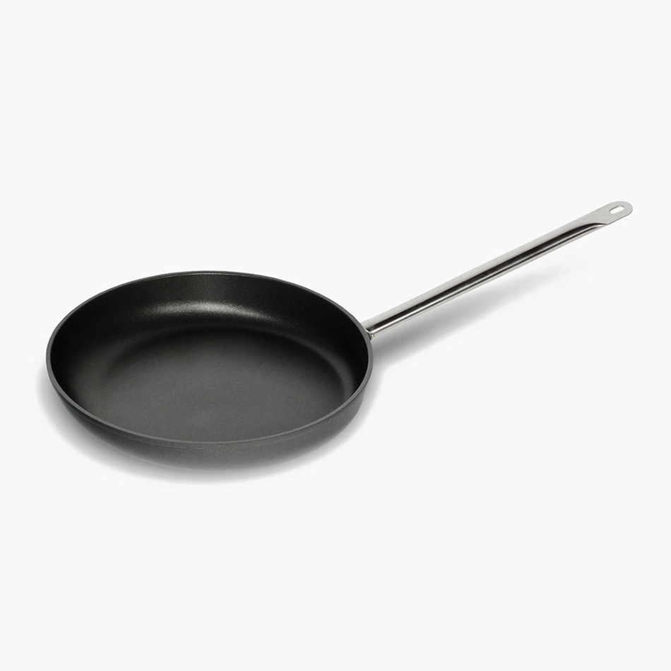 Frying pan with stainless steel handle. Available in a variety of size options. Choose from induction or non-induction options.